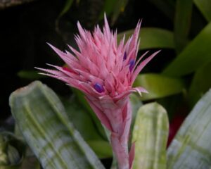 • Aechmea fasciata – die beliebteste Sorte mit ihren charakteristischen rosa-violetten Blütenständen und silbrigen Blättern.